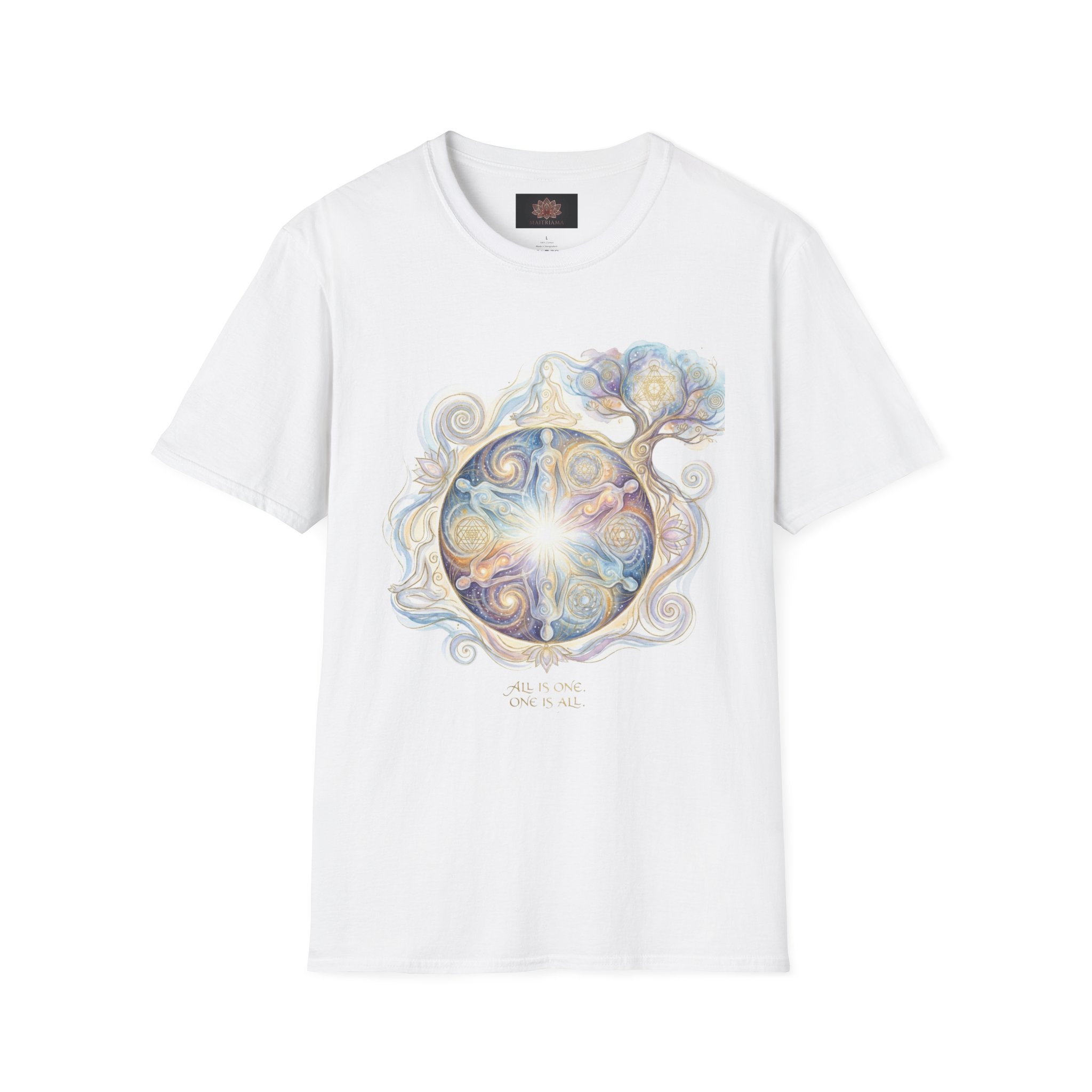All is One and All is One quote resembling the beauty oneness. Lightweight ring-spun cotton drapes softly across the shoulders and settles warm against the skin, so it’s easy to reach for after a long day, during a morning meditation, or while journaling with a cup of tea. The subtle metallic tone gives the message a little lift without shouting; it reads like encouragement from a friend. Built to last and comfortable enough for everyday rituals, this shirt becomes part of the small practices that steady the mind.