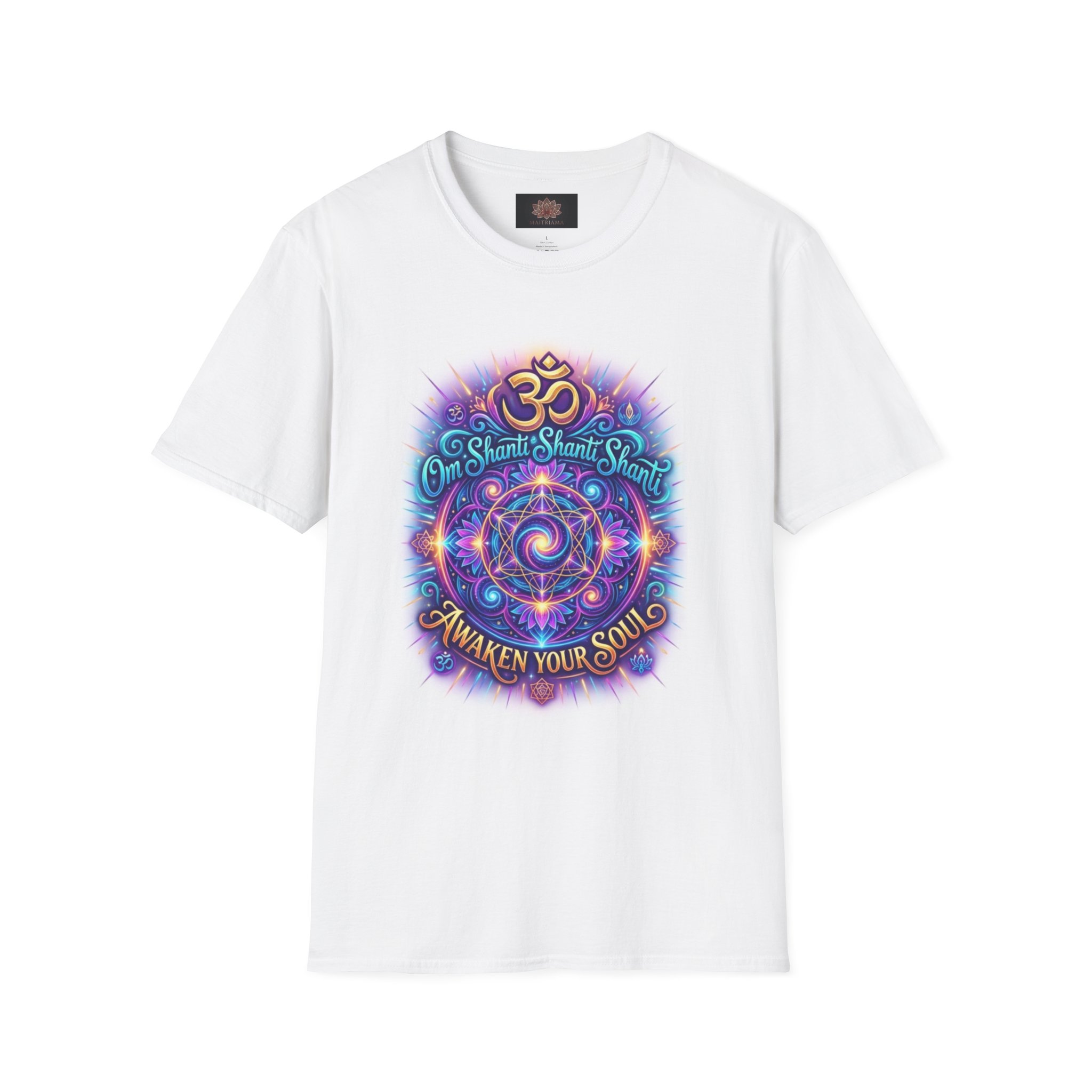 A soft, breathable tee that speaks to quiet mornings and shared exhalations. The shirt carries the gentle chant “om shanti shanti shanti” in a spiritual, vibrant print that feels like a small ritual you can wear — a reminder to slow down, center, and return to calm. It drapes easily over the shoulders and moves with you, layering under a cardigan for an evening meditation or standing alone during a sunlit walk. This tee connects to a mindful rhythm: incense-slow afternoons, community satsangs, and the peaceful hush after a long day.